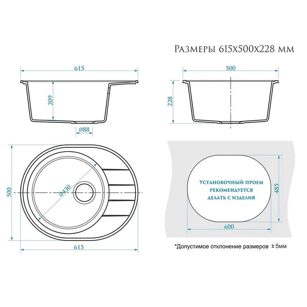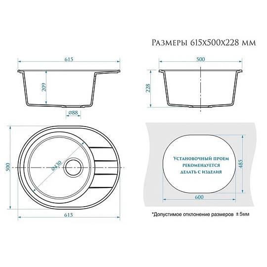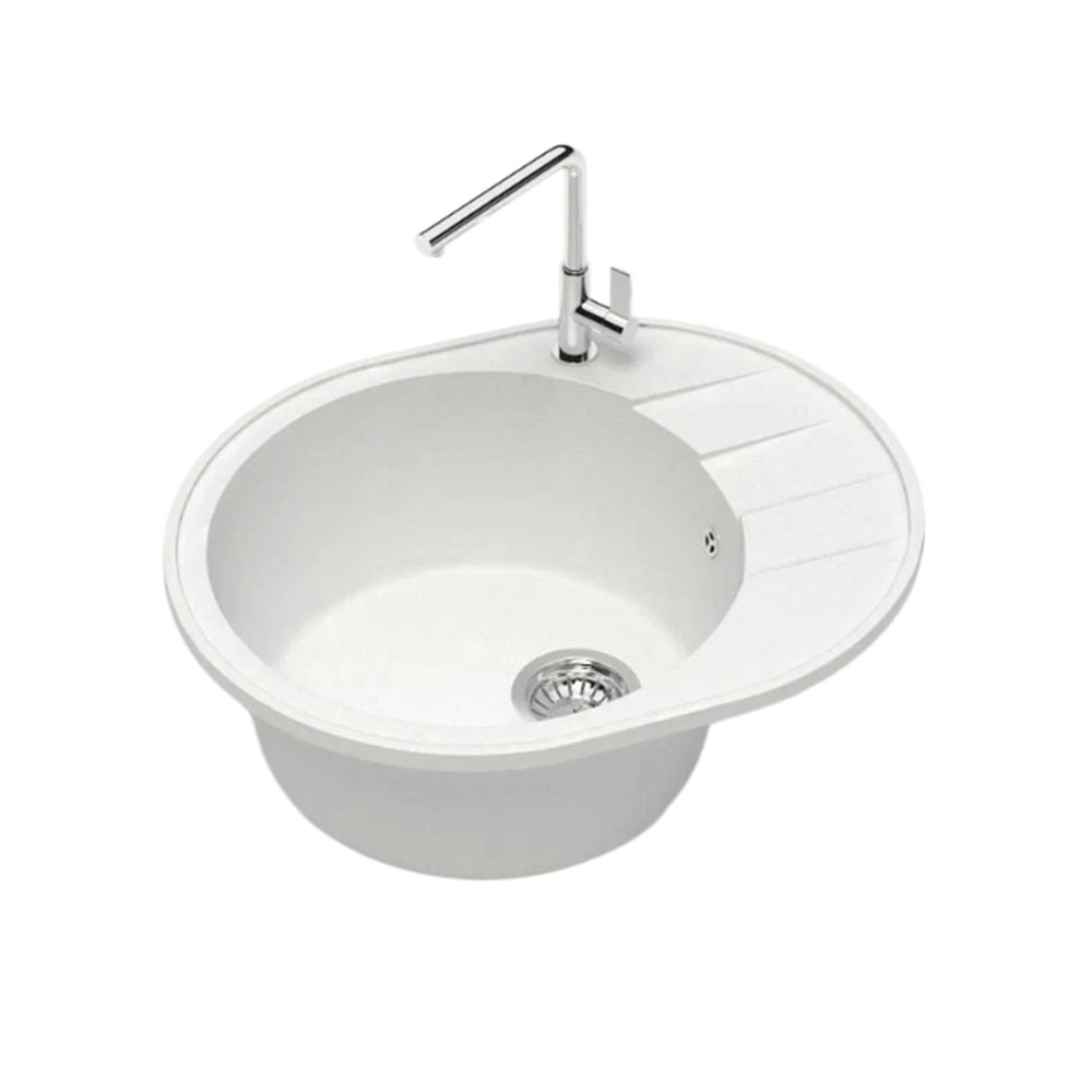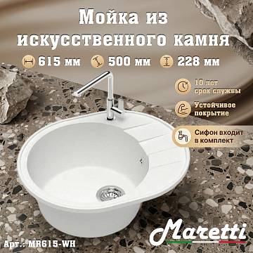 Кухонная мойка Maretti Kitchen MR615-WH, белый. Размер мойки: 61,5*50*22,8 см. Форма: овальная. Крыло: да. Минимальная ширина кухонного шкафа: 50.