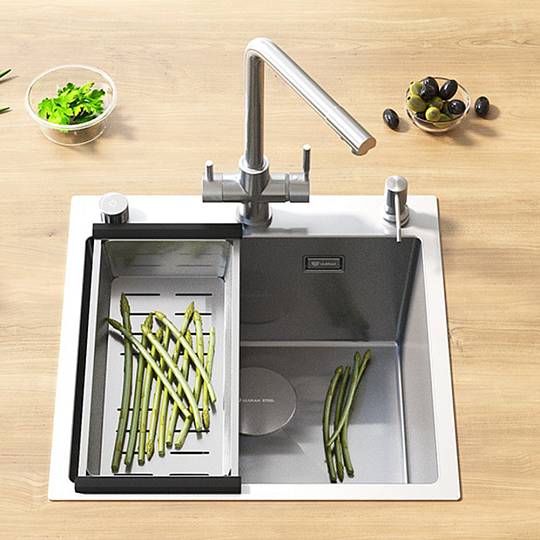 Мойка имеет премиальную толщину монтажной полки 3 мм и увеличенную толщину чаши и крыла 1,2 мм. Эргономичный современный дизайн с глубиной чаши 210 мм делает мойку вместительной и удобной в эксплуатации, а на дне чаши расположены лучи-направляющие, которые позволяют воде легче стекать, не задерживаясь в чаше с горизонтальным плоским дном.  Минимальная мебельная база шкафа составляет 500 мм.