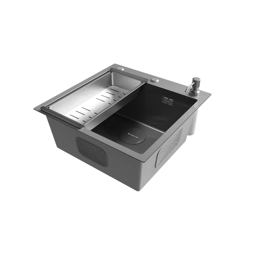 Мойка имеет богатую комплектацию, состоящую из дозатора, коландера из хирургической стали и высококачественной сливной арматуры с лкпаном-полуавтоматом, также сливное отверстие имеет брендированную заглушку.