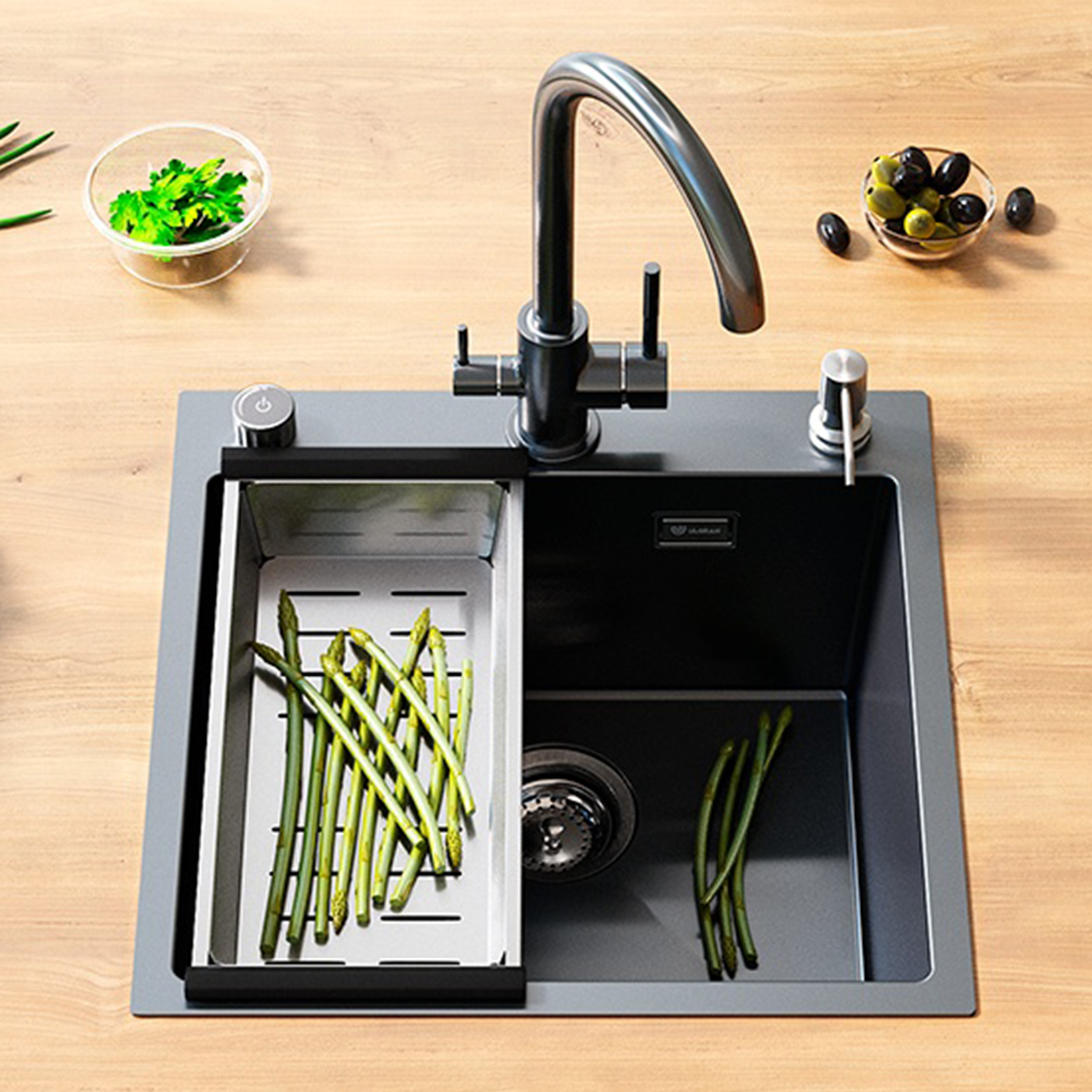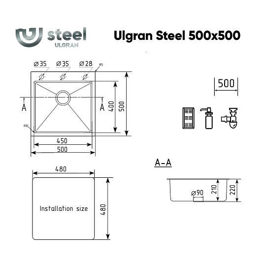 Мойка ULGRAN STEEL 500 Х 500, цвет «черная брашированная сталь» с тремя готовыми отверстиями под клапан-полуавтомат (35 мм), смеситель (35 мм) и дозатор (28 мм) и  с брендированным плоским переливом изготовлена из высококачественной хирургической стали марки AISI 304 и абсолютно безопасна для здоровья человека.