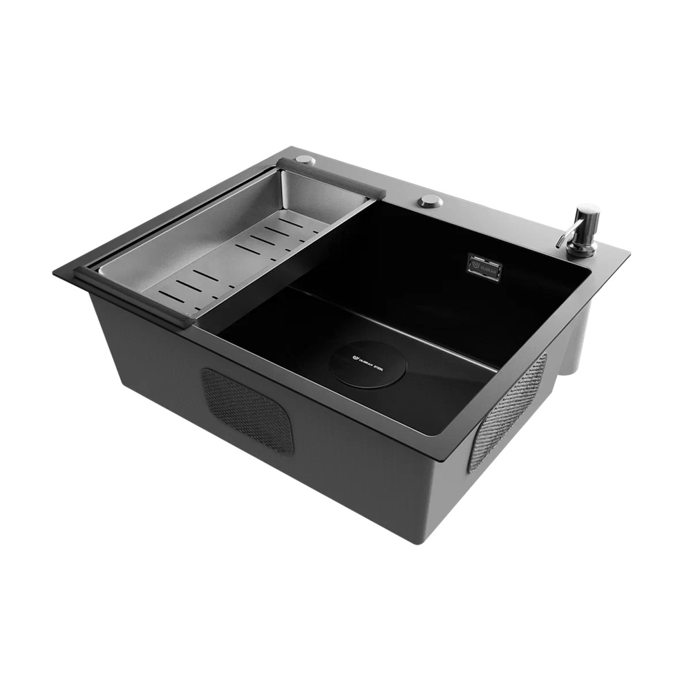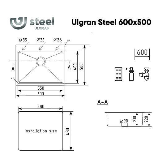 Мойка ULGRAN STEEL 600 Х 500, цвет «вороненая сталь» с тремя готовыми отверстиями под клапан-полуавтомат (35 мм), смеситель (35 мм) и дозатор (28 мм) и  с брендированным плоским переливом изготовлена из высококачественной хирургической стали марки AISI 304 и абсолютно безопасна для здоровья человека.