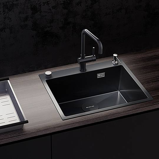 Мойка имеет богатую комплектацию, состоящую из дозатора, коландера из хирургической стали и высококачественной сливной арматуры с клапаном-полуавтоматом, также сливное отверстие имеет брендированную заглушку.