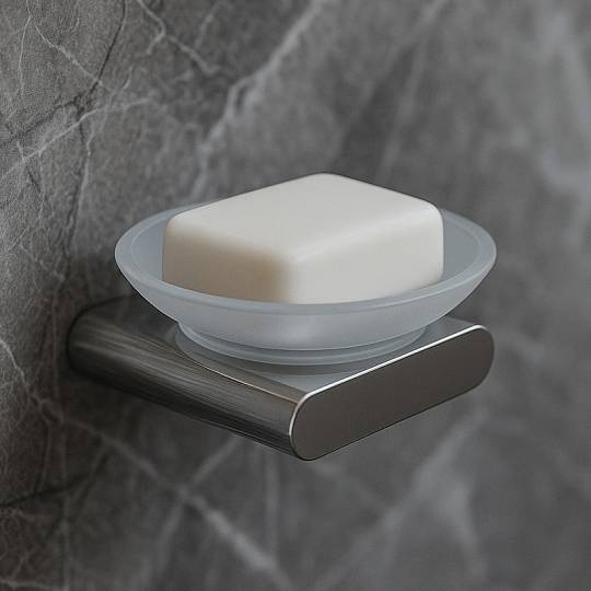 Подвесная мыльница OVAL в хроме с матовым стеклом и корпусом из ZAMAK. Настенный монтаж экономит место на столешнице, а антиследовое покрытие облегчает уход. Стильное решение для современной ванной.