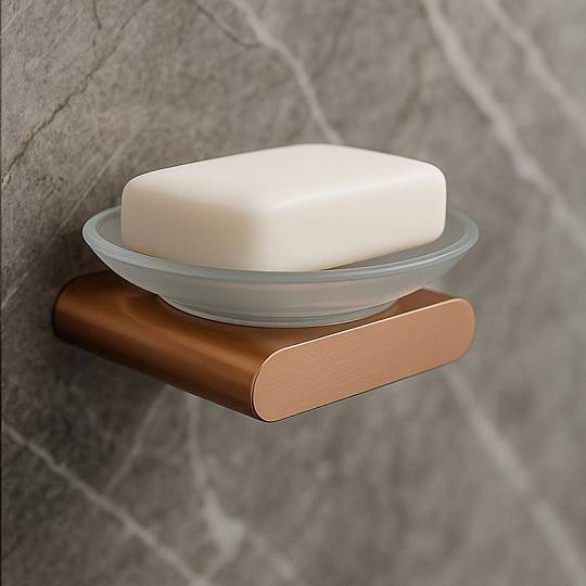 Подвесная мыльница OVAL в бронзовом оттенке с матовым стеклом. Настенное крепление экономит место, сплав ZAMAK с антиследовым покрытием гарантирует долгий срок службы.