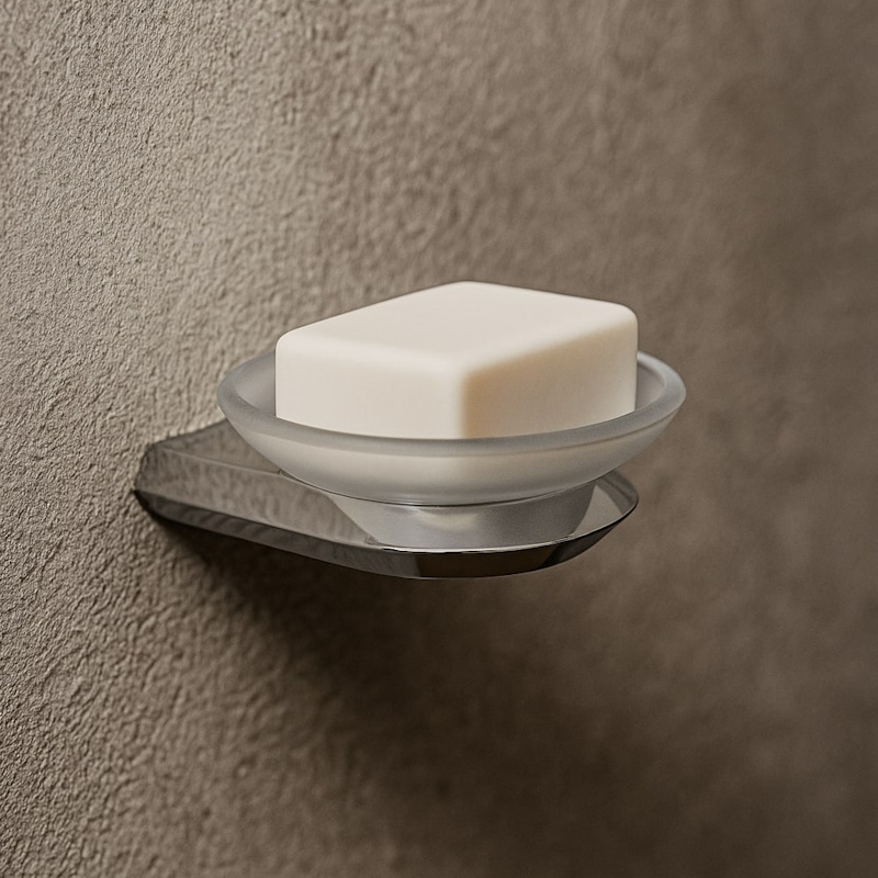 Подвесная мыльница SPACE в хроме с матовым стеклом. Корпус ZAMAK + SUS-201 с антиследовым покрытием надежен, а настенный монтаж экономит место и делает интерьер аккуратным.