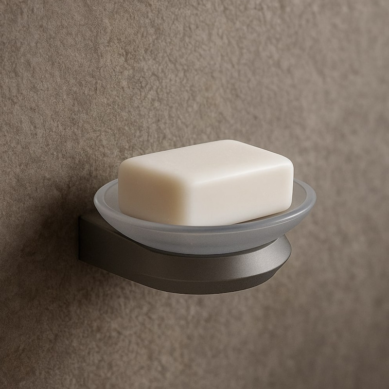 Подвесная мыльница SPACE с отделкой «оружейная сталь» и матовым стеклом. Настенный монтаж экономит место, сплав ZAMAK + SUS-201 с антиследовым покрытием гарантирует надежность и простоту ухода.