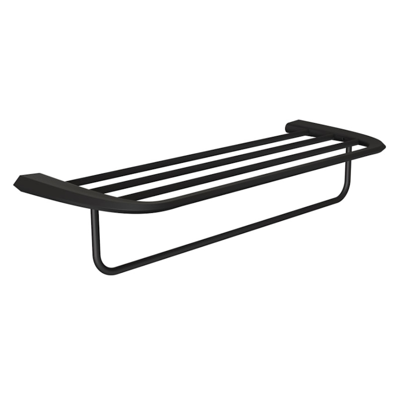 Полка для полотенец в матовом чёрном оформлении — акцент современного интерьера. Комбинация ZAMAK и стали SUS-201 гарантирует надёжность, а матовая фактура с антиследовым покрытием не боится отпечатков и ежедневного ухода.