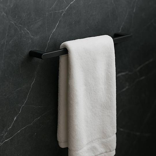 Матовый черный держатель для полотенец придаёт ванной современный минималистичный вид. Прочный корпус из нержавеющей стали SUS 304 защищён от влаги и коррозии. Матовая поверхность с антиследовым покрытием облегчает уход.