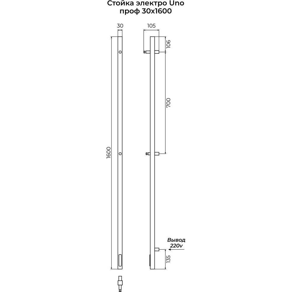 Полотенцесушитель электрический Terminus Стойка UNO проф 160, черный