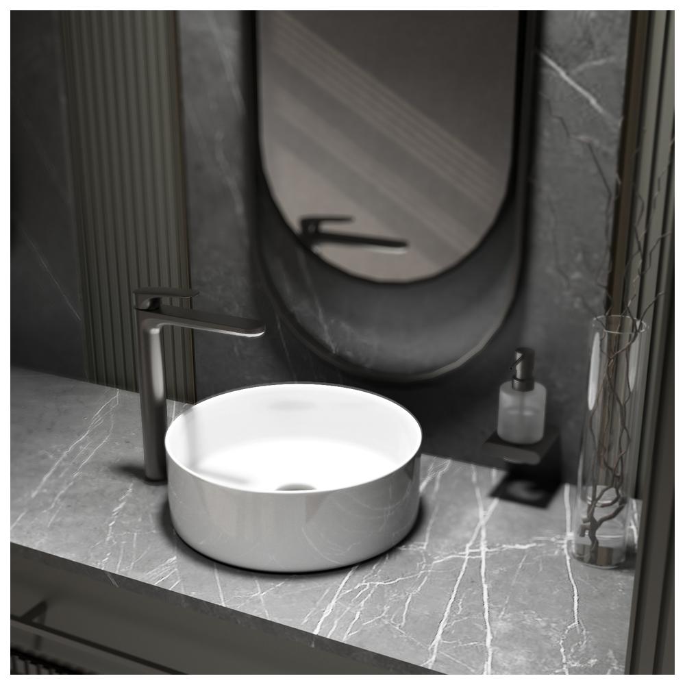 Керамическая раковина круглой формы с антибактериальной глазурью. За счет компактных размеров модель идеально подходит для небольших ванных комнат.