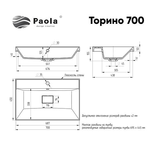 Врезная раковина Paola Torino 700  с отверстием под смеситель и декоративным элементом на сливе имеет современный, стильный и эргономичный дизайн. Возможна установка раковины на тумбу  (вровень)  или на столешницу. Раковина выполнена из прочного износостойкого литьевого мрамора, сверху покрыта специальным защитным покрытием гелькоутом. Исполнение поверхности Glossy Shine - изделие обладает глянцевым блеском, очень приятное на ощупь и даже при минимальном уходе сохраняет безупречный цвет и внешний вид на долгие годы. В комплекте - слив-перелив, а также декоративный элемент, под которой спрятан слив,  технический паспорт и гарантийный талон. Заводская гарантия составляет 5 лет, срок службы более 10 лет.