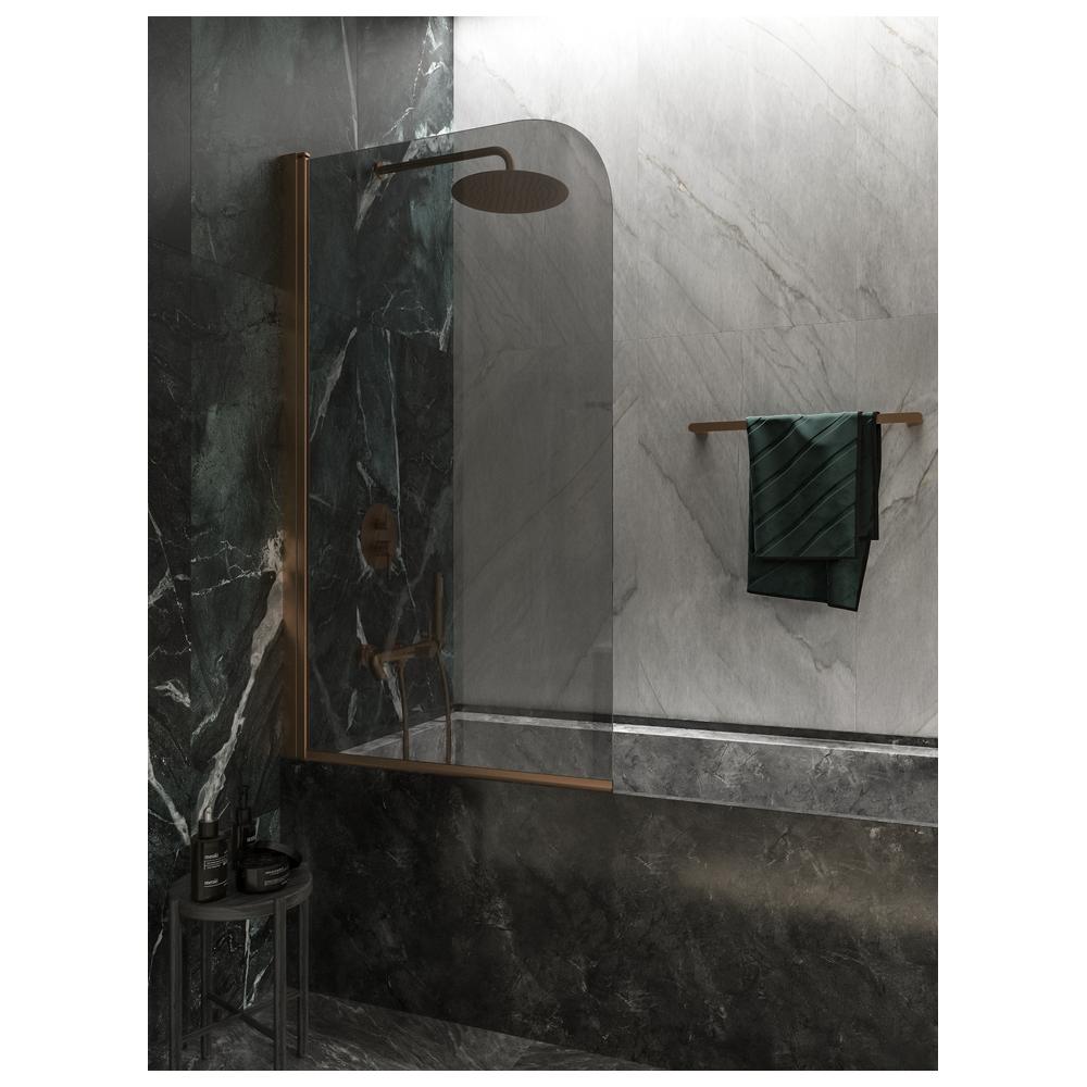 Стильная шторка с тонированным стеклом и бронзовым матовым профилем. Модель подчеркивает современный интерьер ванной и обеспечивает лёгкий уход благодаря гидрофобному покрытию Smart Clean.