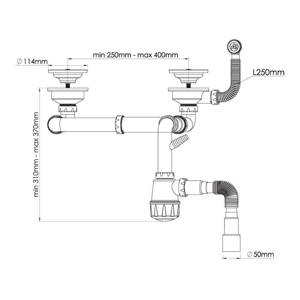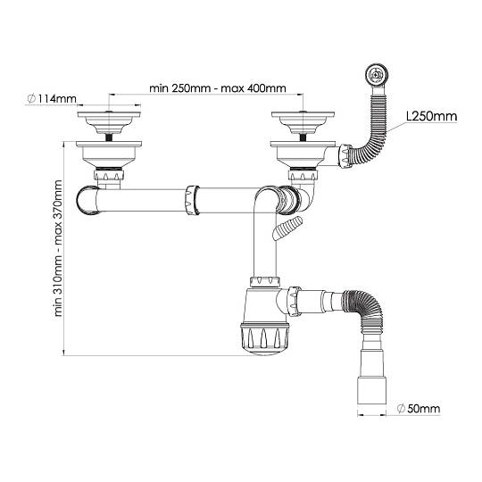 Сифон для керамической мойки с двумя чашами с выпусками 3 1/2 разноуровневый, 60мм винт, круглый перелив 35мм, выход гибкая труба G 1'1/2" - Ø40/50мм