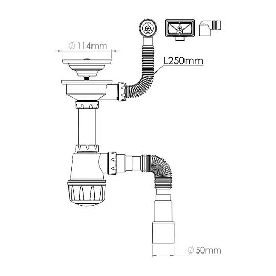 Универсальный евросифон для керамической и нержавеющей мойки с выпусками 114мм (3 1/2") с отводом для стиральной машины. С круглым и прямоугольным переливом, большая колба, пластмассовый винт 45мм, выход гибкая труба G 1'1/2" - Ø40/50мм (AISI 201 нержавеющая сталь чашки и металический щтуцер).