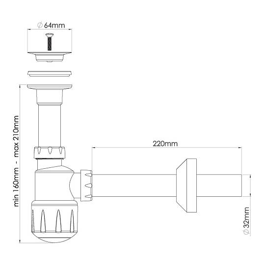 Сифон для умывальника, выпуск 64мм, длина винта 65мм, выход прямая труба 32мм