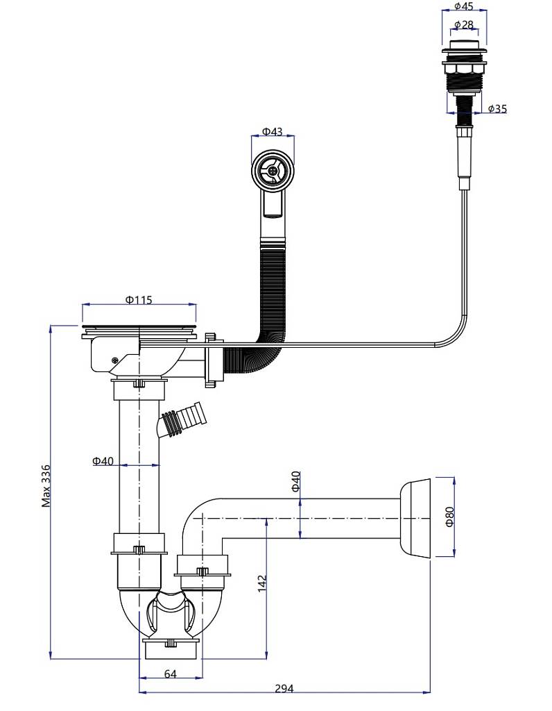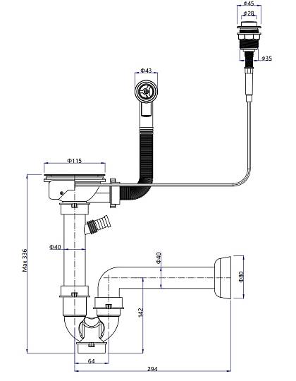Сифон одинарный 3 1/2" п/авт с круг пер черный