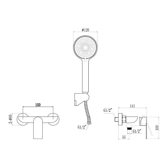 Смеситель, душевая лейка, шланг, эксцентрики, настенный держатель
