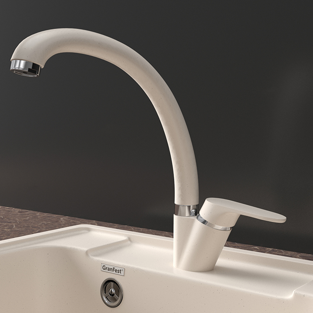 Смеситель для кухни GranFest Z-3323, белый. Материал: латунь. Управление: рычажное. Подключение фильтра для воды: нет. Гибкая подводка. Отверстия для монтажа: 1.