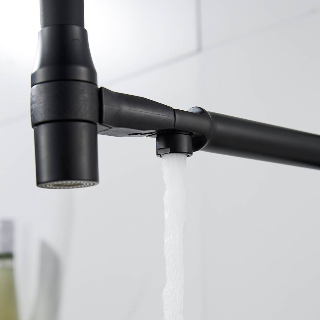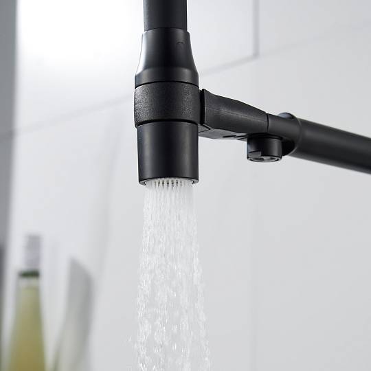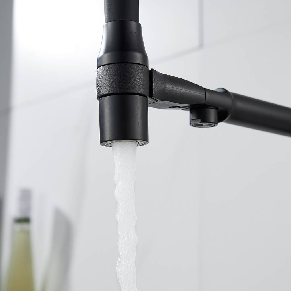 Для водопроводной воды предусмотрен гибкий излив с дополнительным режимом «душ»: достаточно повернуть кончик излива, чтобы переключиться на мягкий рассеивающий поток. В положении покоя излив надёжно фиксируется на основании смесителя с помощью магнитов. Особая деталь конструкции — поверхность вокруг магнитов выполнена из ABS‑пластика, что полностью исключает риск повреждения лакокрасочного покрытия соприкасающихся элементов и сохраняет эстетичный вид смесителя на долгие годы.