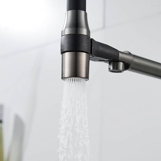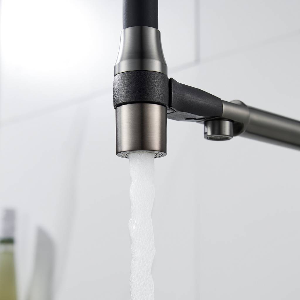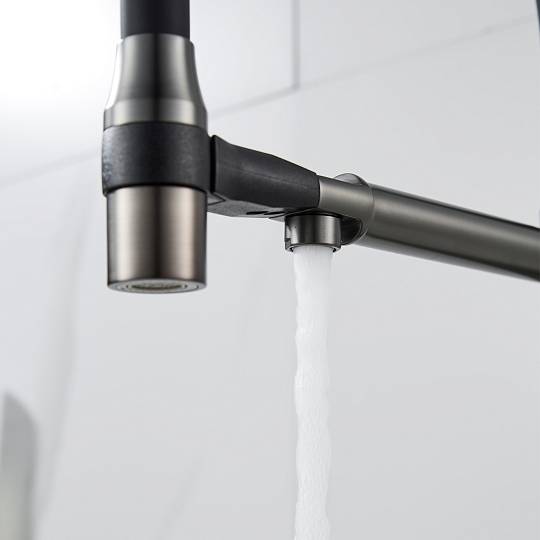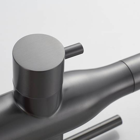 Для водопроводной воды предусмотрен гибкий излив с дополнительным режимом «душ»: достаточно повернуть кончик излива, чтобы переключиться на мягкий рассеивающий поток. В положении покоя излив надёжно фиксируется на основании смесителя с помощью магнитов. Особая деталь конструкции — поверхность вокруг магнитов выполнена из ABS‑пластика, что полностью исключает риск повреждения лакокрасочного покрытия соприкасающихся элементов и сохраняет эстетичный вид смесителя на долгие годы.
