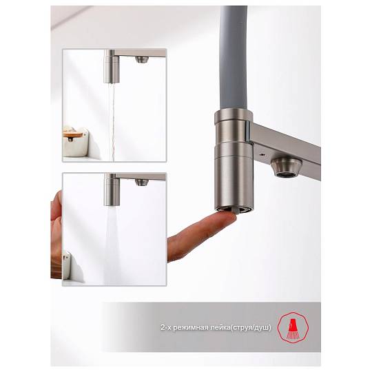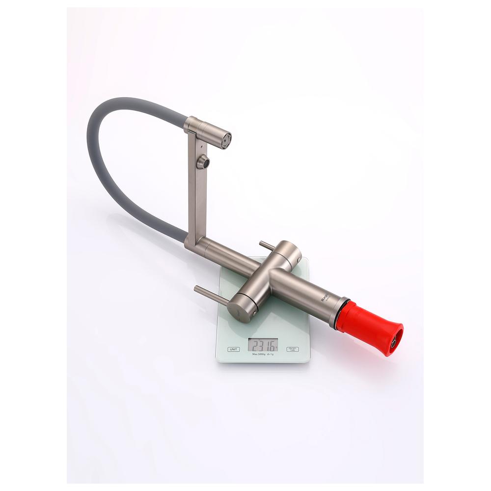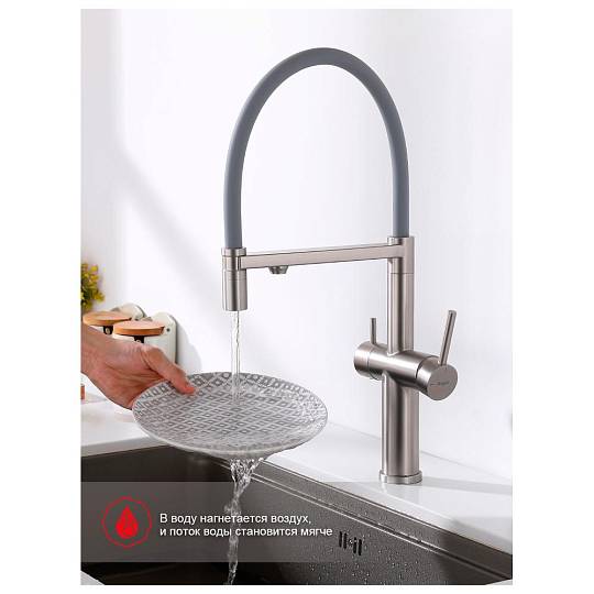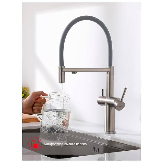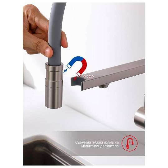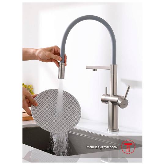 Дополнительный излив служит не только для подачи фильтрованной воды, но и как держатель для гибкого излива, когда тот не используется, что добавляет удобства в повседневном использовании.