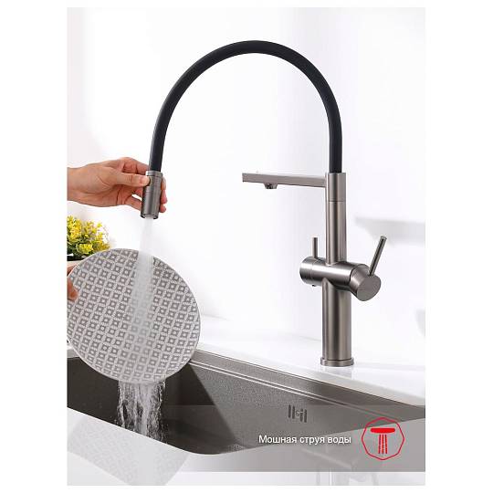 Дополнительный излив служит не только для подачи фильтрованной воды, но и как держатель для гибкого излива, когда тот не используется, что добавляет удобства в повседневном использовании.