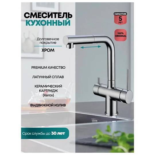 Смеситель для кухни с подключением к фильтру и выдвижным изливом. Керамический картридж Kerox (Венгрия).