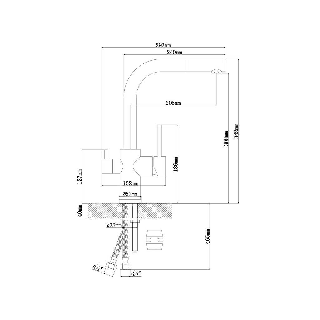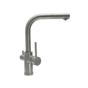 Кухонный смеситель с подключением к фильтру чистой воды. Выдвижной, поворотный излив. Материал – нержавеющая сталь. Керамический картридж – 35 мм. Гибкая подводка.