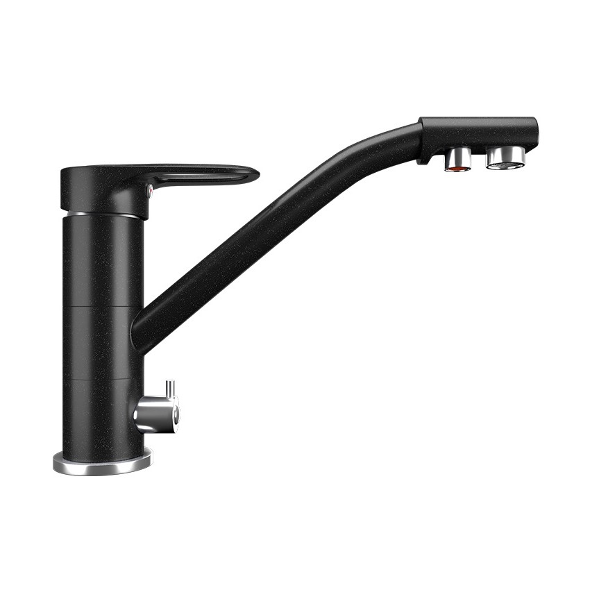 ULGRAN U-010 - высокоэргономичный кухонный смеситель с дополнительным краном для подключения фильтрованной воды, оснащенный кран-буксой с керамическими пластинами. Реализован тройной подвод воды через один излив: холодная, горячая и фильтрованная. Переход с одного подвода на другой производится поворотом рычага. Набор для соединения с фильтром входит в комплект . Система фильтрации приобретается дополнительно и монтируется под мойку, специальный индикатор сообщает о необходимости замены картриджа. Материал корпуса выполнен из высококачественной латуни, а окрашивание под "искусственный камень" в цвет мойки ULGRAN выполняется на собственном производстве, что позволяет идеально попасть в фирменный цвет ULGRAN. В качестве керамического картриджа используется известный бренд Wanhai диаметром 35 мм с высокой пропускной способностью в 500 тысяч циклов "открывания-закрывания".  На подвижные части картриджа  Wanhai  нанесена специальная невымываемая силиконовая смазка, а керамические пластины изготовлены из 96% оксида алюминия, что, в сочетании с высоким качеством шлифовки обеспечивает долговечность, надежность, плавность хода рукоятки.  Смеситель оборудован съемным пластиковым аэратором для экономии воды  и поворотным изливом на 360 градусов. В комплектацию входя:  керамический картридж  Wanhai, гибкая подводка, комплект крепежных элементов,  кран-букса с керамическими пластинами для дополнительного излива для фильтрованной воды, набор для подсоединения фильтра питьевой воды (гибкая подводка + переходник-цанга), технический паспорт и гарантийный талон. Заводская гарантия составляет 3 года на материал корпуса, 1 год на комплектующие к смесителю и 1 год на материал покрытия.