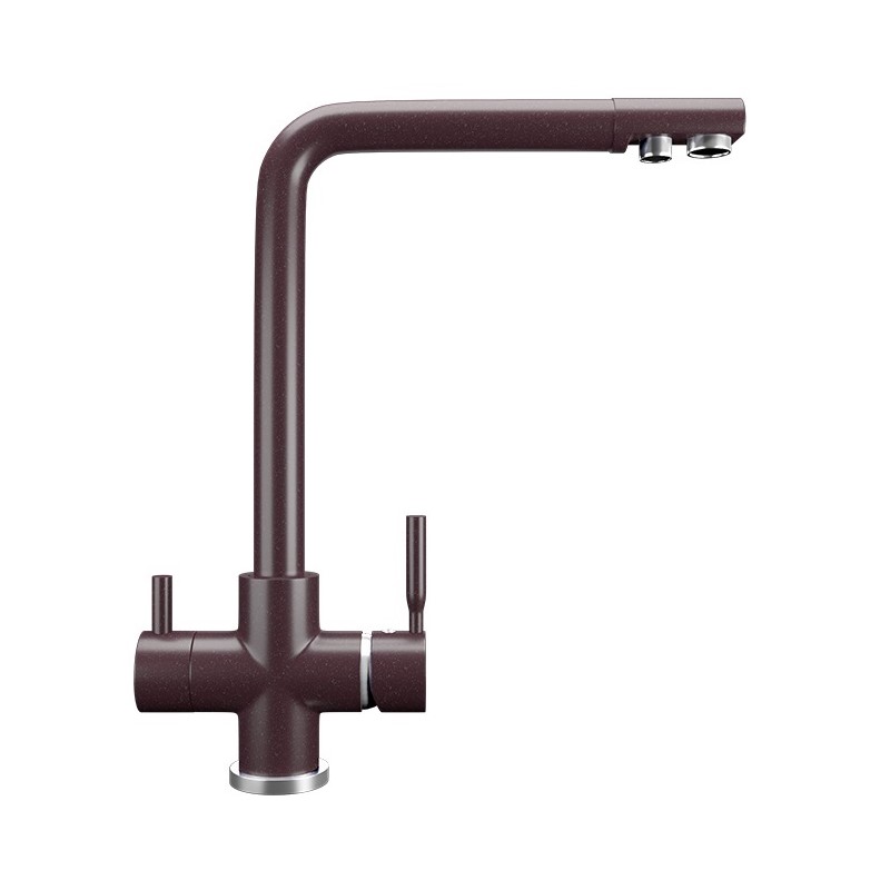 ULGRAN U-016 - высокоэргономичный кухонный смеситель с дополнительным краном для подключения фильтрованной воды, оснащенный кран-буксой с керамическими пластинами. Реализован тройной подвод воды через один излив: холодная, горячая и фильтрованная. Переход с одного подвода на другой производится поворотом рычага. Набор для соединения с фильтром входит в комплект . Система фильтрации приобретается дополнительно и монтируется под мойку, специальный индикатор сообщает о необходимости замены картриджа. Материал корпуса выполнен из высококачественной латуни, а окрашивание под "искусственный камень" в цвет мойки ULGRAN выполняется на собственном производстве, что позволяет идеально попасть в фирменный цвет ULGRAN. В качестве керамического картриджа используется известный бренд Wanhai диаметром 35 мм с высокой пропускной способностью в 500 тысяч циклов "открывания-закрывания".  На подвижные части картриджа  Wanhai  нанесена специальная невымываемая силиконовая смазка, а керамические пластины изготовлены из 96% оксида алюминия, что, в сочетании с высоким качеством шлифовки обеспечивает долговечность, надежность, плавность хода рукоятки.  Смеситель оборудован съемным пластиковым аэратором для экономии воды  и поворотным изливом на 360 градусов. В комплектацию входят:  керамический картридж  Wanhai, гибкая подводка, комплект крепежных элементов,  кран-букса с керамическими пластинами для дополнительного излива для фильтрованной воды, набор для подсоединения фильтра питьевой воды (гибкая подводка + переходник-цанга), технический паспорт и гарантийный талон. Заводская гарантия составляет 3 года на материал корпуса, 1 год на комплектующие к смесителю и 1 год на материал покрытия.