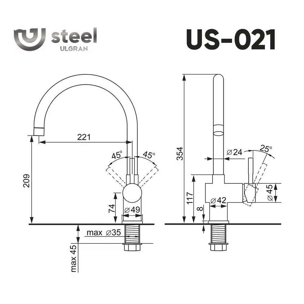 ULGRAN STEEL 021  -  однорычажный кухонный смеситель с высоким поворотным изливом. Корпус из высококачественной хирургической стали марки AISI 304 делает смеситель долговечным и устойчивым  к коррозии, перепадам давления и температур. Важнейшей особенностью смесителя является то, что цвет идеально совпадает с фирменными цветами моек из нержавеющей стали ULGRAN STEEL и легко подобрать комплект, превратив мойку в настоящий эргономичный центр. В ассортименте имеются цвета "брашированная сталь", "черная брашированная сталь" и "вороненая сталь".  В качестве керамического картриджа используется известный бренд Wanhai диаметром 40 мм с высокой пропускной способностью в 500 тысяч циклов "открывания-закрывания".  На подвижные части картриджа  Wanhai  нанесена специальная невымываемая силиконовая смазка, а керамические пластины изготовлены из 96% оксида алюминия, что, в сочетании с высоким качеством шлифовки обеспечивает долговечность, надежность, плавность хода рукоятки.  Смеситель оборудован съемным пластиковым аэратором для экономии воды  и поворотным изливом на 360 градусов. В комплектацию входят: керамический картридж  Wanhai, гибкая подводка 450 мм, комплект крепежных элементов, технический паспорт и гарантийный талон.   Заводская гарантия составляет 3 года на материал корпуса,  1 год на комплектующие к смесителю и 1 год на материал покрытия.