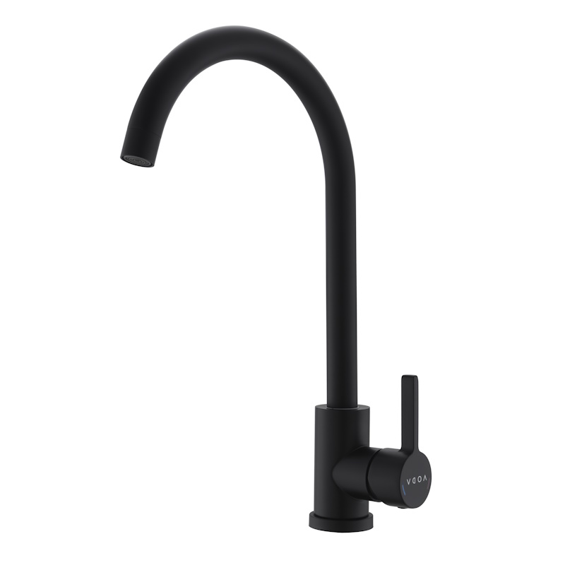 Смеситель для кухни Voda Kitchen K 55B с высоким поворотным изливом, изготовленным из нержавеющей стали. Элегантный черный акцент для вашей кухни.
