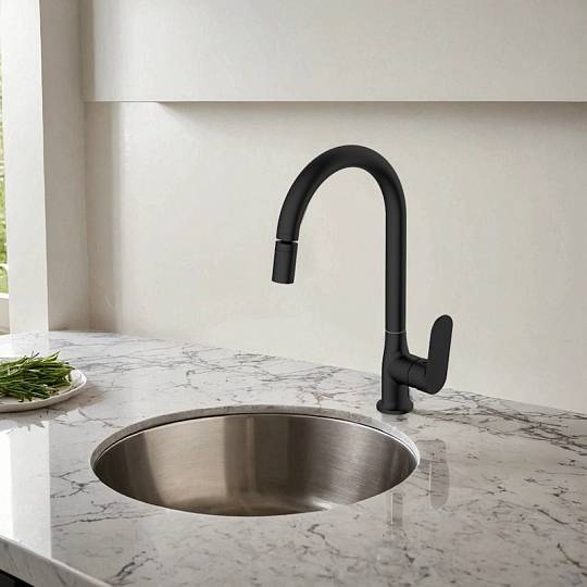 Ищете смеситель, который станет изюминкой вашей кухни? Модель "Shore Black" – это идеальное сочетание стиля и практичности. Черный матовый корпус из латуни придает смеситель элегантный вид, а поворотный аэратор обеспечивает максимальный комфорт при использовании.