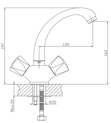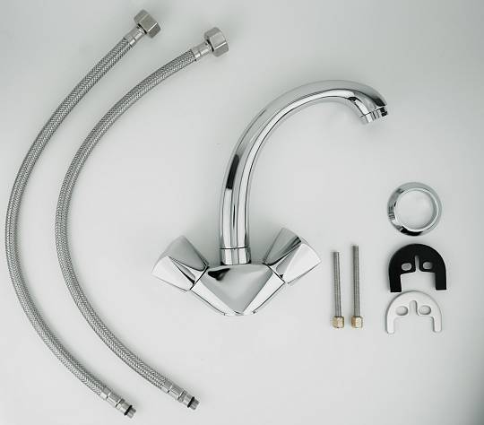 Корпус: латунь кат.A  Ручки: металл, с защитой от нагревания   Излив: поворотный, нерж.сталь Кран-буксы: универсальные ESKO, ход 180 градусов Комплектация: пьедестал(металл), крепление "две шпильки",гибкая подводка 45см