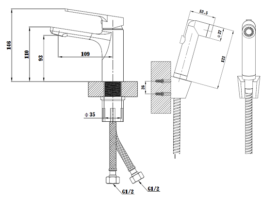 Комплектация: пьедестал, крепление "FastFix",гибкая подводка 40см., гиг лейка с держателем (ABS пластик), шланг душевой 1,2м
