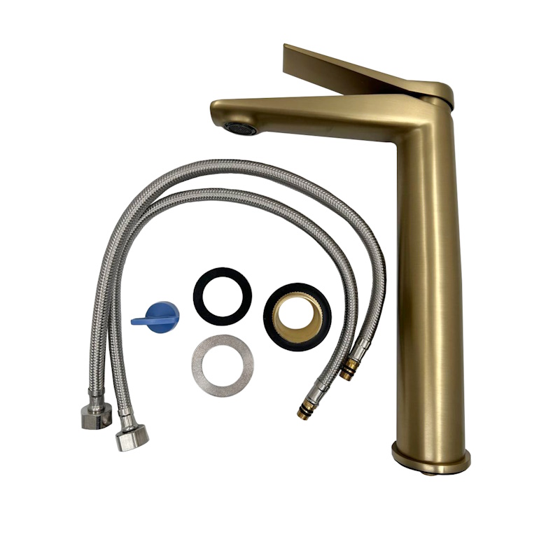 Смеситель для раковины высокий Esko SHA25Gold, золотой сатин. Производство: Россия. Гарантия: 10 лет. Материал: латунь. Управление: рычажное. Излив: традиционный,фиксированный. Подводка: гибкая, 1/2" .