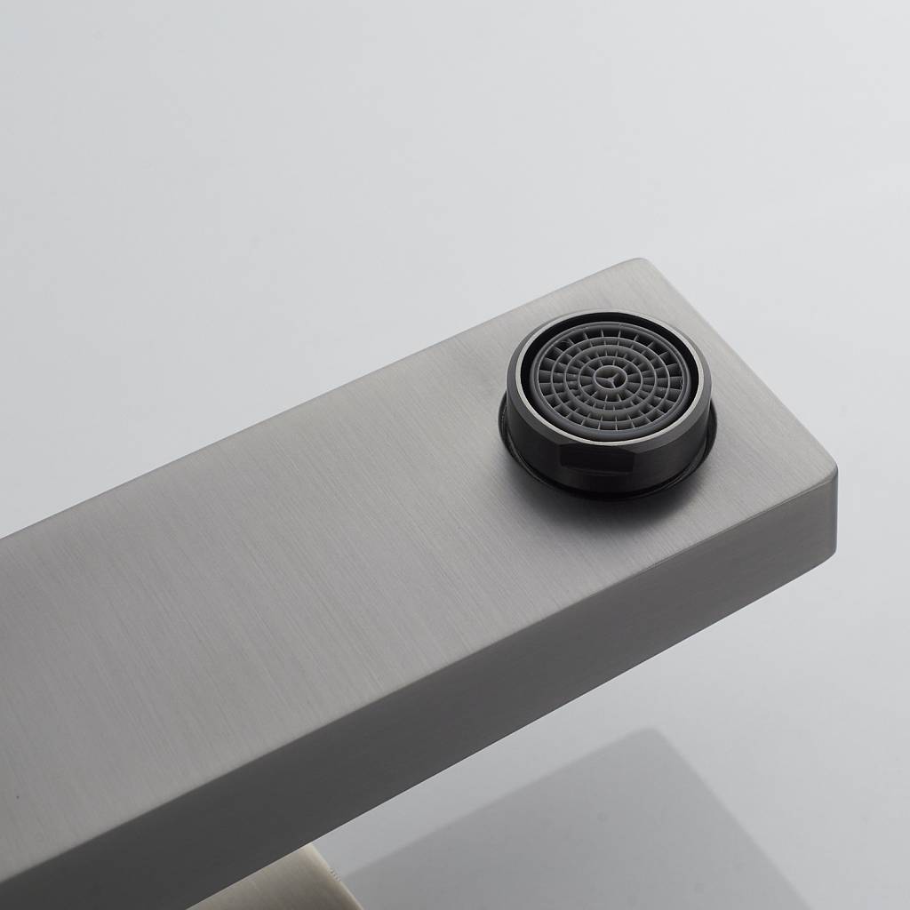 Внутреннее устройство смесителя отвечает самым высоким стандартам качества. Керамический картридж обеспечивает плавное и точное регулирование температуры и напора воды, а эргономичное рычажное управление делает процесс максимально комфортным. Фиксированный излив оснащён современным аэратором, который не только насыщает поток воздуха, делая его мягким и равномерным, но и способствует рациональному расходу воды.