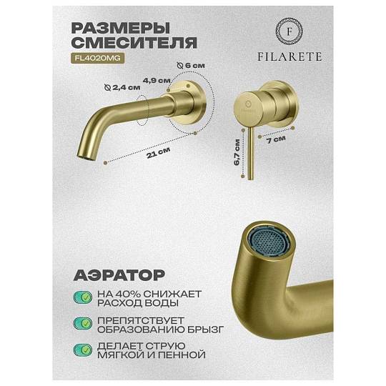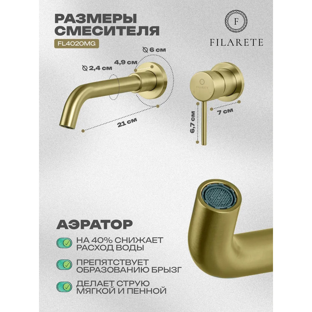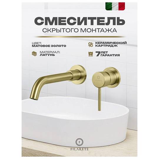 Смеситель для раковины встраиваемый FILARETE Roun FL4020MG, матовое золото. Гарантийный срок: 7 лет. Управление: рычажное. Стилистика дизайна: современный стиль. Материал: латунь. Монтаж: внутренний (скрытый).