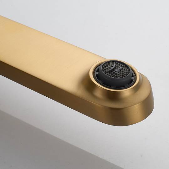 Фиксированный излив с продуманной формой плавно направляет струю, а съёмный аэратор делает воду мягкой и насыщенной, предотвращая брызги и экономя расход. Благодаря встроенному уровню внутри корпуса монтаж проходит легко и точно — вы можете быть уверены, что смеситель будет установлен идеально ровно.