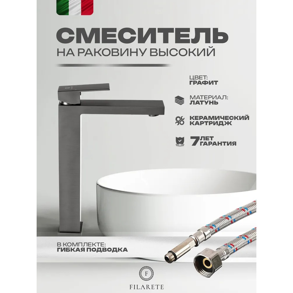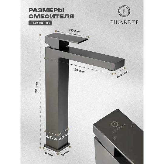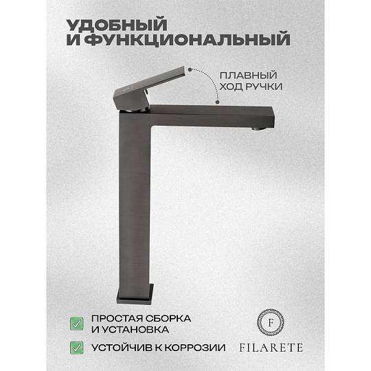 Смеситель для раковины высокий FILARETE Fing FL6040BG, графит. Гарантийный срок: 7 лет. Управление: рычажное. Стилистика дизайна: современный стиль. Материал: латунь. Монтаж: на столешницу.