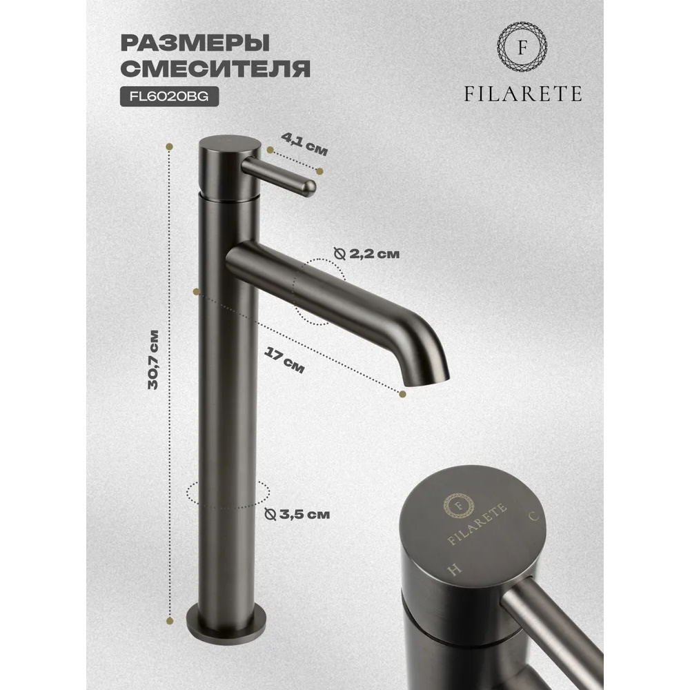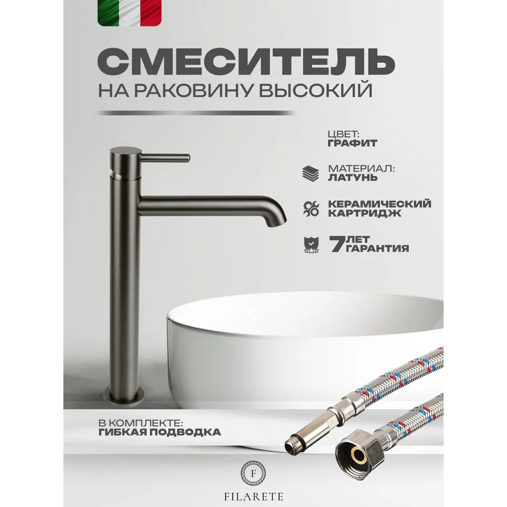 Смеситель для раковины высокий FILARETE Roun FL6020BG, графит. Гарантийный срок: 7 лет. Управление: рычажное. Стилистика дизайна: современный стиль. Материал: латунь. Монтаж: на столешницу.