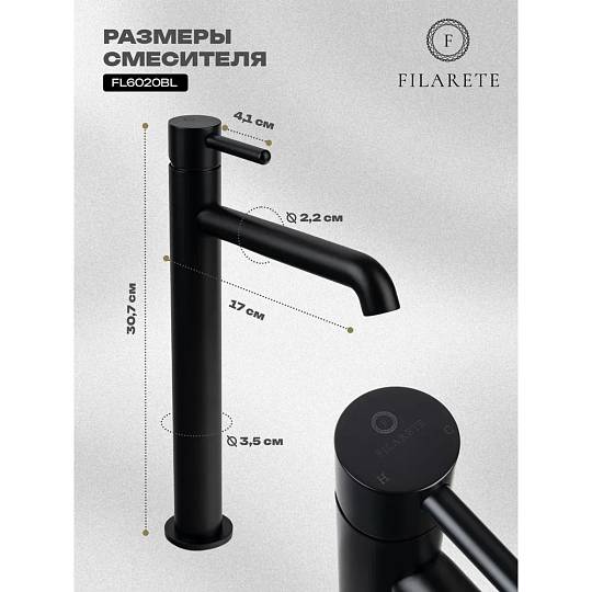 Смеситель для раковины высокий FILARETE Roun FL6020BL, черный. Гарантийный срок: 7 лет. Управление: рычажное. Стилистика дизайна: современный стиль. Материал: латунь. Монтаж: на столешницу.