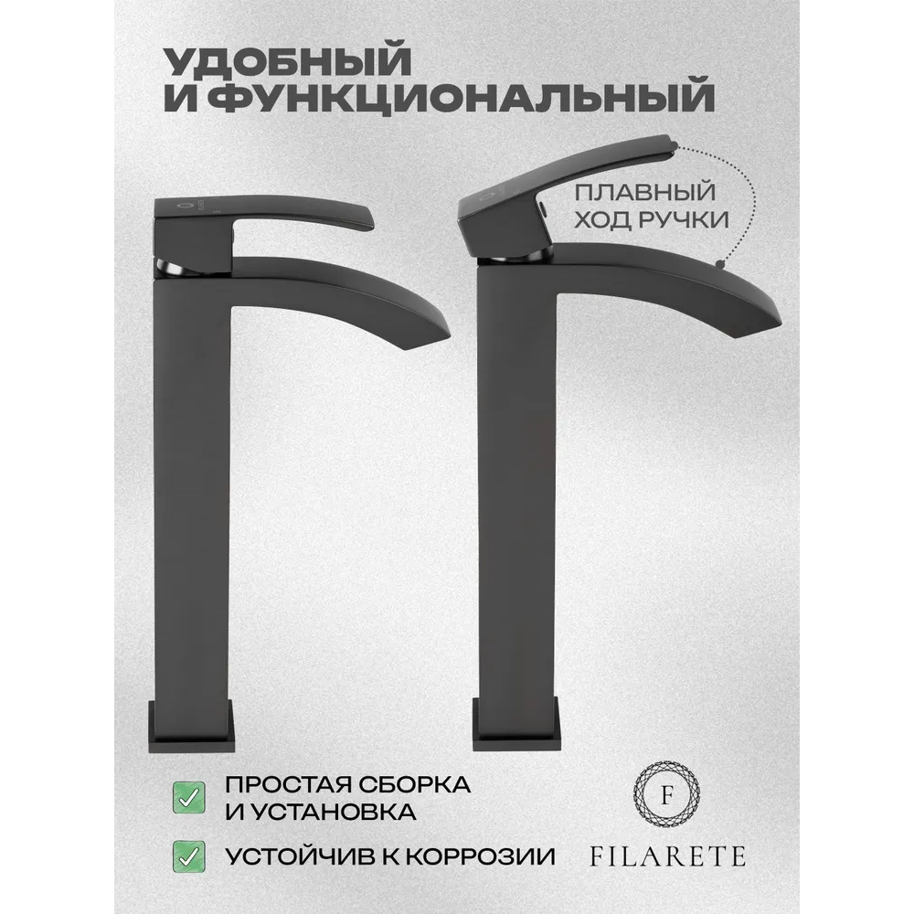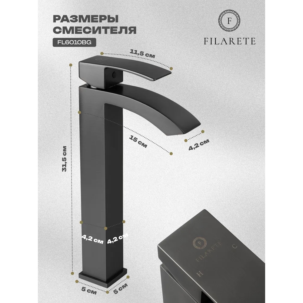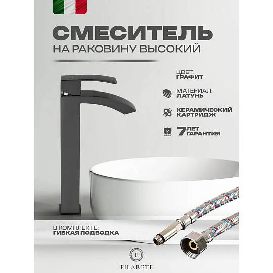 Смеситель для раковины высокий FILARETE Waterfall FL6010BG, графит. Гарантийный срок: 7 лет. Управление: рычажное. Стилистика дизайна: современный стиль. Материал: латунь. Монтаж: на столешницу.