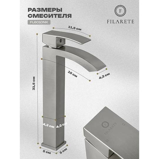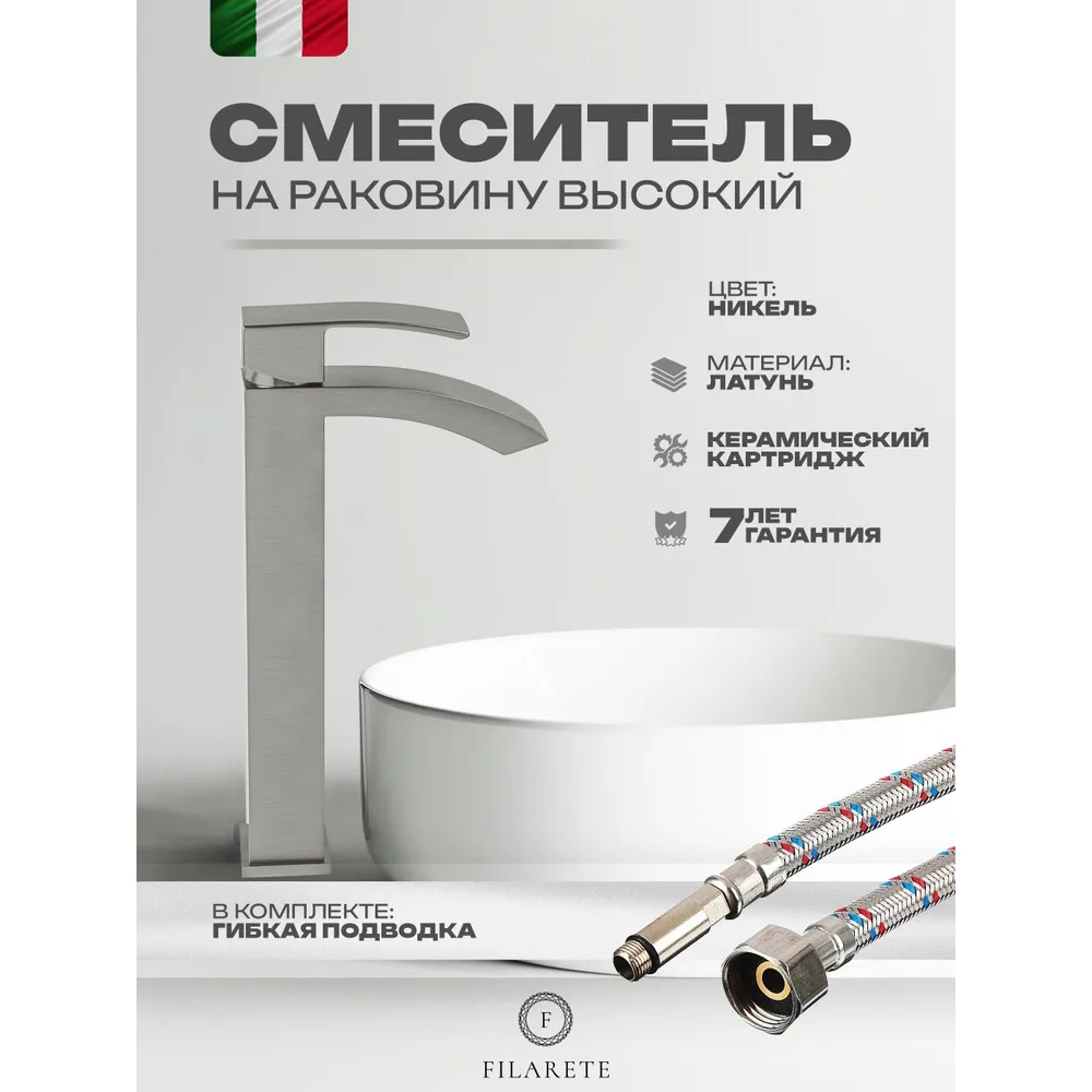 Смеситель для раковины высокий FILARETE Waterfall FL6010NK, никель. Гарантийный срок: 7 лет. Управление: рычажное. Стилистика дизайна: современный стиль. Материал: латунь. Монтаж: на столешницу.
