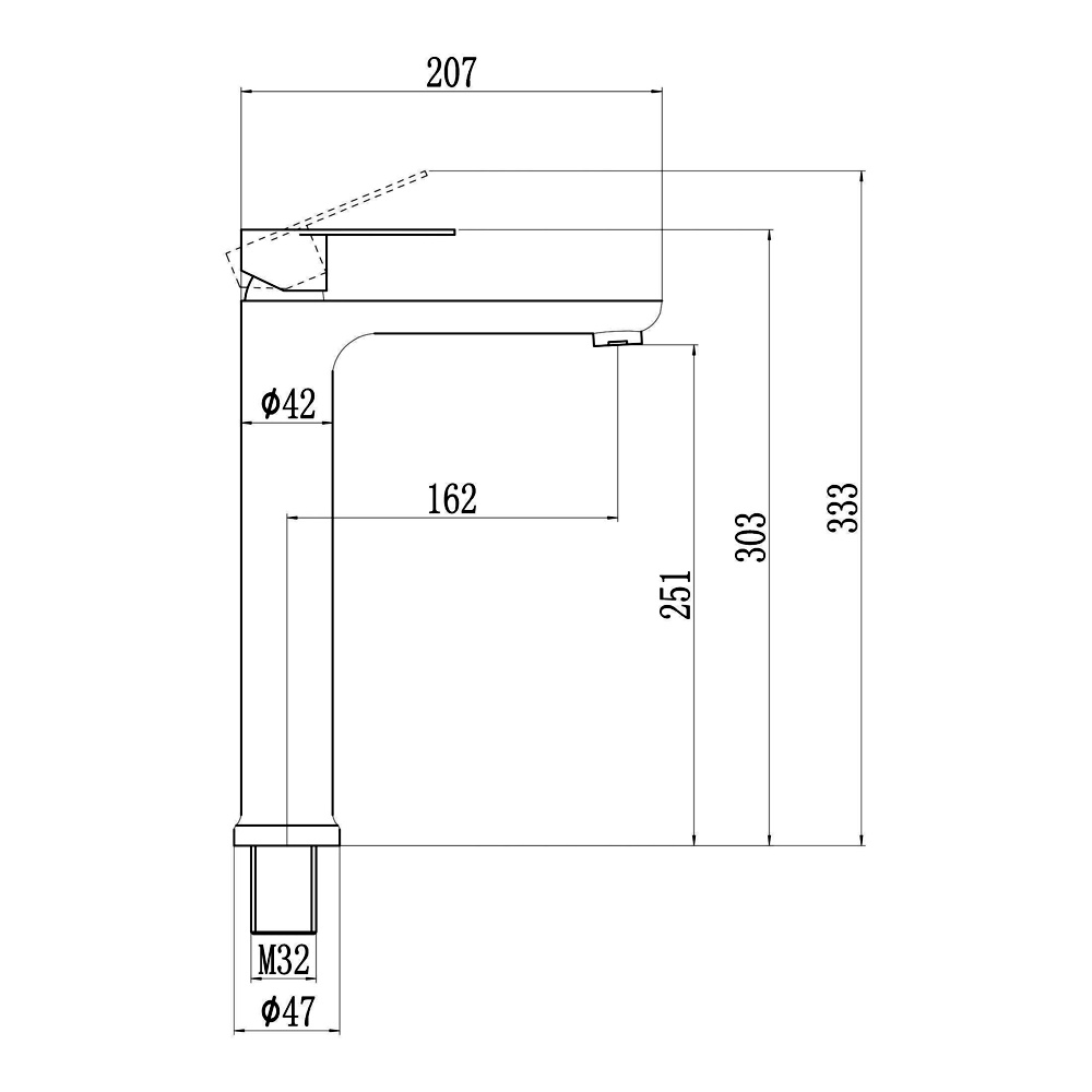 Fmark FS8811C — дизайнерский смеситель для умывальника, выполненный из нержавеющей стали AISI 304. Элегантный силуэт с расширением нижней части корпуса подчёркивает премиальный стиль и относит модель к категории дизайнерских решений. Высокий корпус делает её идеальной для отдельно стоящих раковин-чаш.