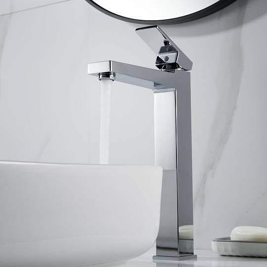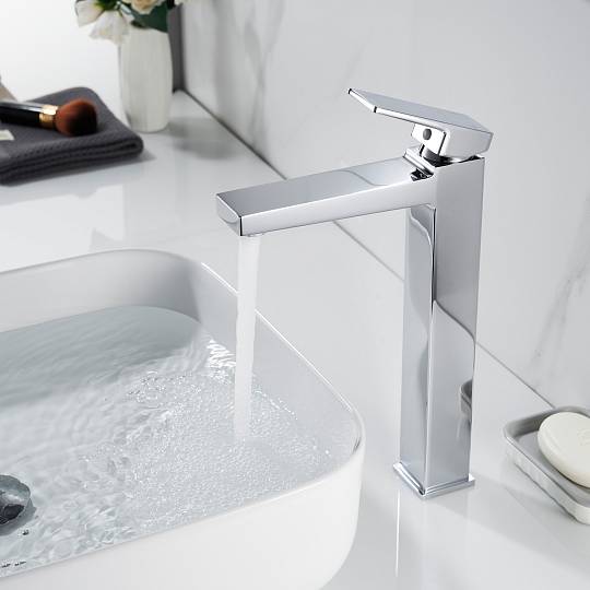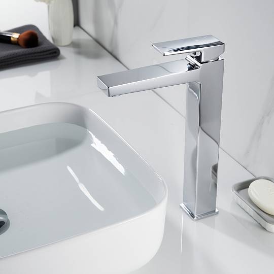 Особого внимания заслуживает высокий фиксированный излив, оснащённый современным аэратором. Такая конструкция идеально подходит для раковин‑чаш: она обеспечивает комфортный доступ к воде, а аэратор, насыщая поток воздухом, формирует мягкую, равномерную струю и помогает сократить расход воды без потери комфорта.