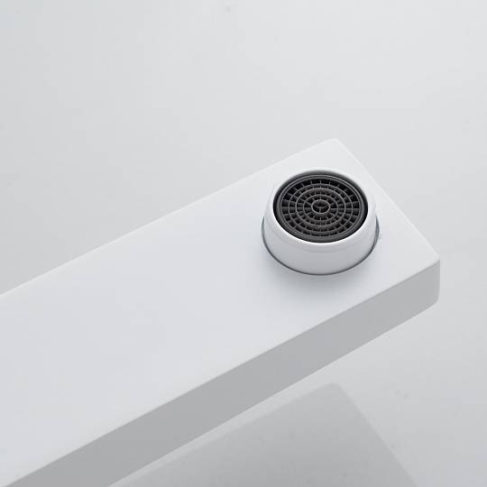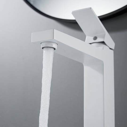 Особого внимания заслуживает высокий фиксированный излив, оснащённый современным аэратором. Такая конструкция идеально подходит для раковин‑чаш: она обеспечивает комфортный доступ к воде, а аэратор, насыщая поток воздухом, формирует мягкую, равномерную струю и помогает сократить расход воды без потери комфорта.