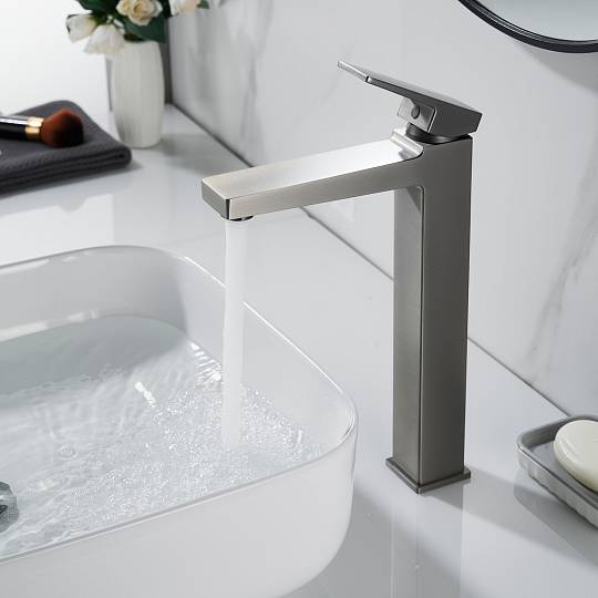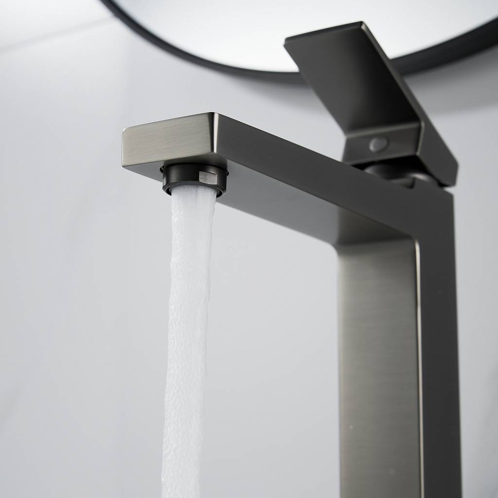 Особого внимания заслуживает высокий фиксированный излив, оснащённый современным аэратором. Такая конструкция идеально подходит для раковин‑чаш: она обеспечивает комфортный доступ к воде, а аэратор, насыщая поток воздухом, формирует мягкую, равномерную струю и помогает сократить расход воды без потери комфорта.