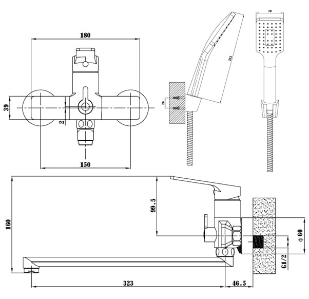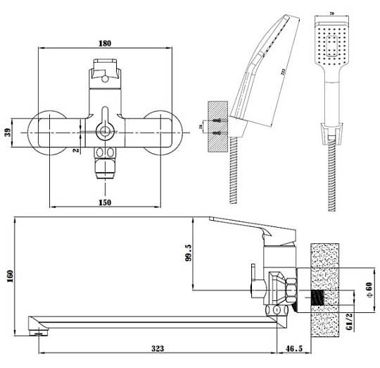 Корпус: латунь кат.A, покрытие "черный матовый" Излив: поворотный, 320мм  Картридж: универсальный ESKO, 35мм    Комплектация: эксцентрики, отражатели, шланг душевой (в мет. оплетке - 150см.), лейка душевая(1 режим), настенный держатель для лейки
