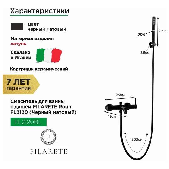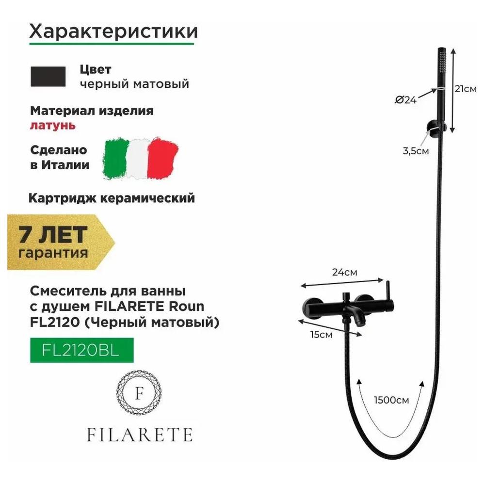 Смеситель для ванны FILARETE Roun FL2120BL, черный. Гарантия: 7 лет. Цвет: черный. Количество режим душевой лейки: 1.